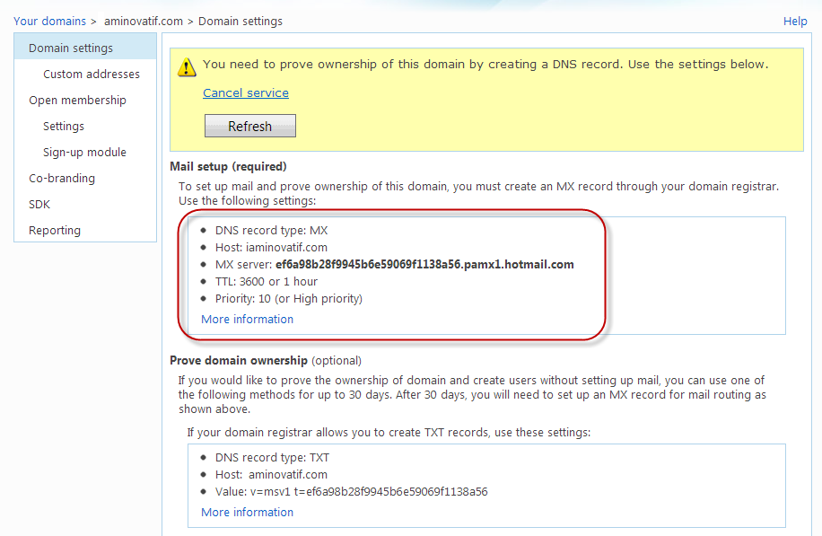 10. Kembali ke domain panel di website outlook.com tadi, tunggu 15-30 menit untuk propogasi MX. Setelah itu klik tombol Refresh.