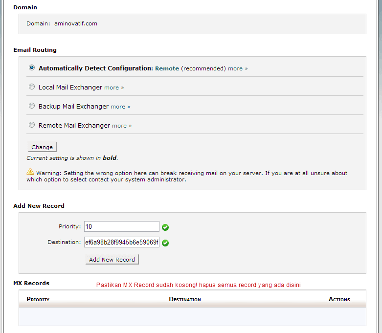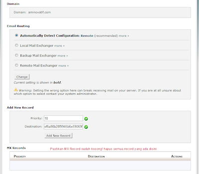 9. Masukkan data-data dari panel email anda di Microsoft tadi ke Add New Record. Pastikan bahwa tidak ada record lain dikolom record dibawah. Jika ada, hapus dulu.