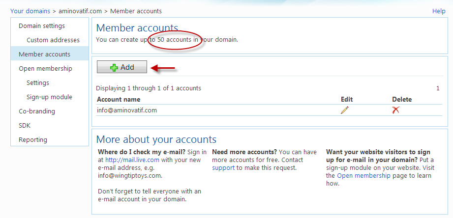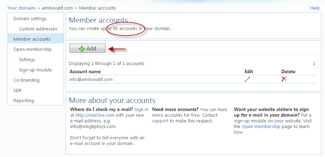 11. Jika berhasil, maka domain panel anda akan aktif. Anda dapat membuat akun email sampai 50 akun. Untuk pengajuan sampai 500 akun, anda dapat menghubungi pihak Microsoft disana.